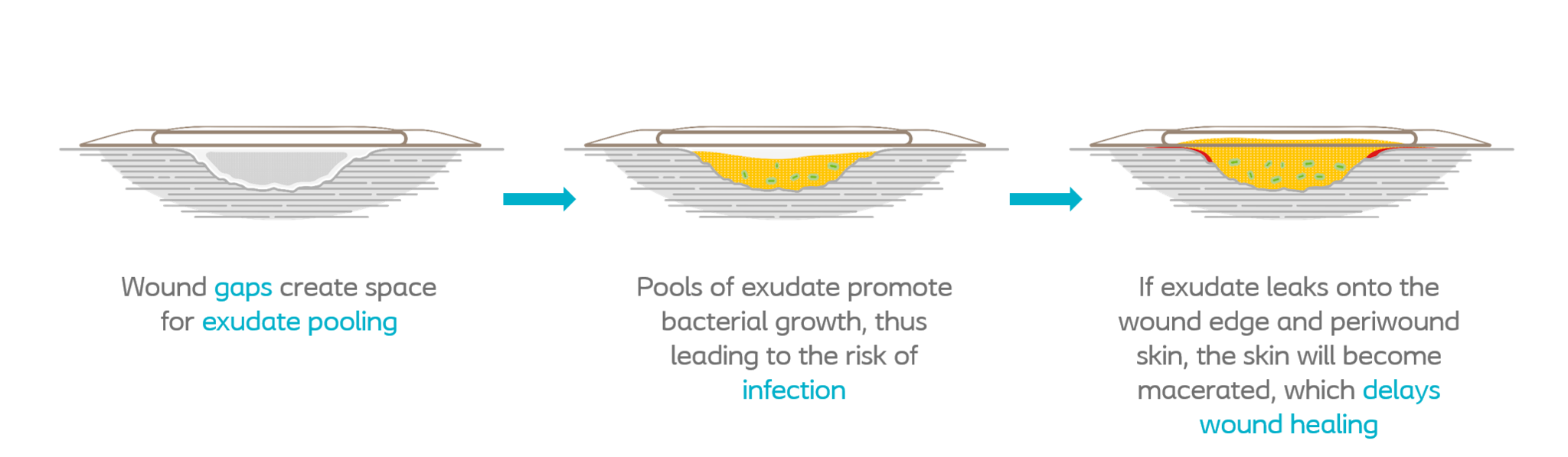 Wenn Sie bemerken, dass sich Wundexsudat ansammelt, oder wenn Sie glauben, dass die Zusammensetzung des Exsudats die Heilung der Wunde verhindert, sollten sie zuerst das überschüssige Exsudat entfernen. Ausschlaggebend hierfür ist die Wahl des richtigen Wundverbands und die Kontrolle des Hohlraums.